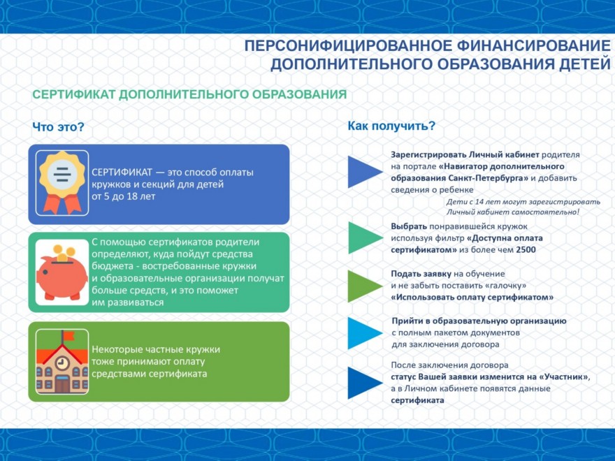 Сертификат – это персональная гарантия государства перед ребенком в том, что он может посещать любые лицензированные кружки или секции дополнительного образования, размещенные на сайте Навигатора ДО, за счет бюджета. Это не документ, который нужно носить с собой, а электронная запись в информационной системе. Сертификат присваивается каждому ребенку от 5 до 18 лет. У сертификата есть номинал – бюджетные деньги, которые можно потратить только на оплату кружка или секции. Размер номинала определяют муниципальные власти.