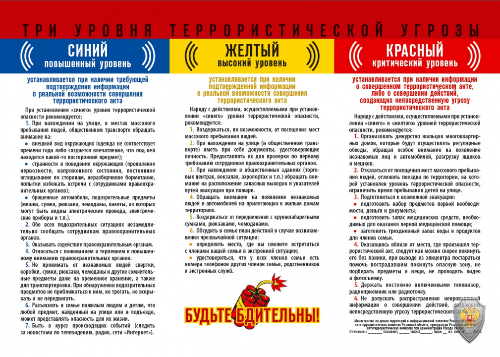 В соответствии с Федеральным законом от 6 марта 2006 г. № 35-ФЗ «О противодействии терроризму» в целях своевременного информирования населения о возникновении угрозы террористического акта и организации деятельности по противодействию его совершению, осуществляемой Национальным антитеррористическим комитетом во взаимодействии с федеральными органами исполнительной власти, органами государственной власти субъектов Российской Федерации, органами местного самоуправления и в соответствии с указом Президента Российской Федерации от 14 июня 2012 г. № 851 могут устанавливаться уровни террористической опасности, предусматривающие принятие дополнительных мер по обеспечению безопасности личности, общества и государства.