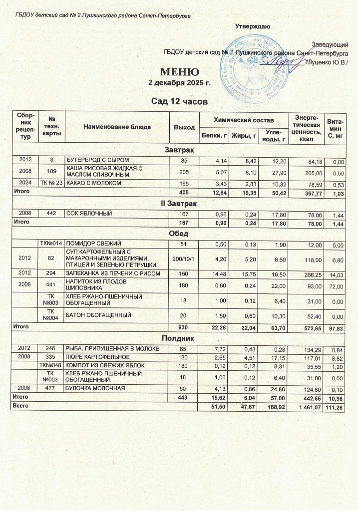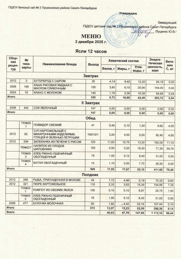 Меню на 02 декабря 2025 года