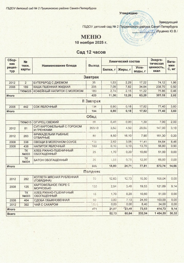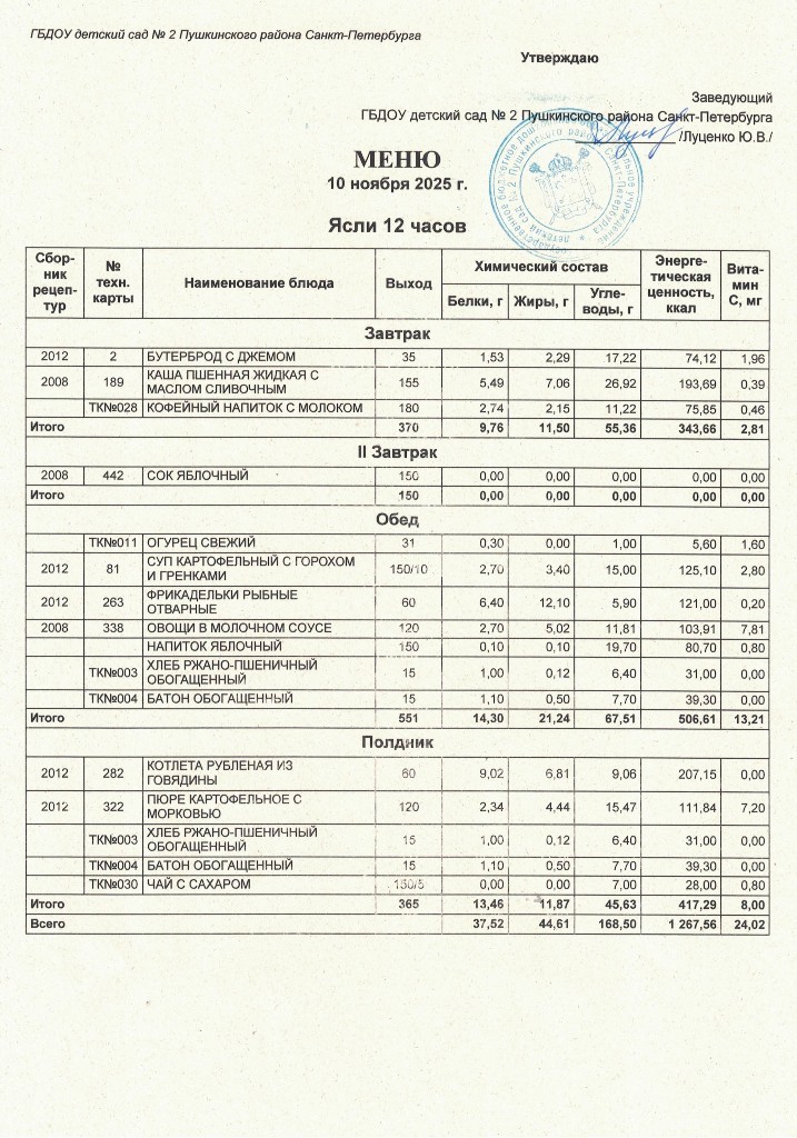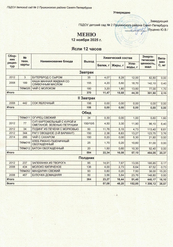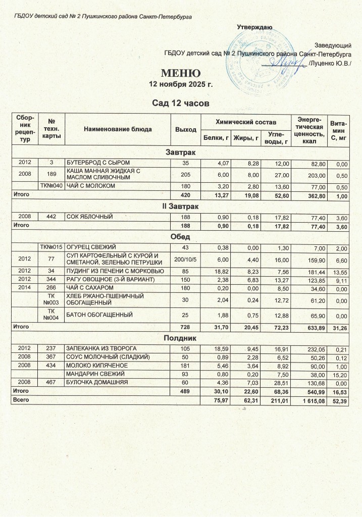 Меню на 12 ноября 2025 года