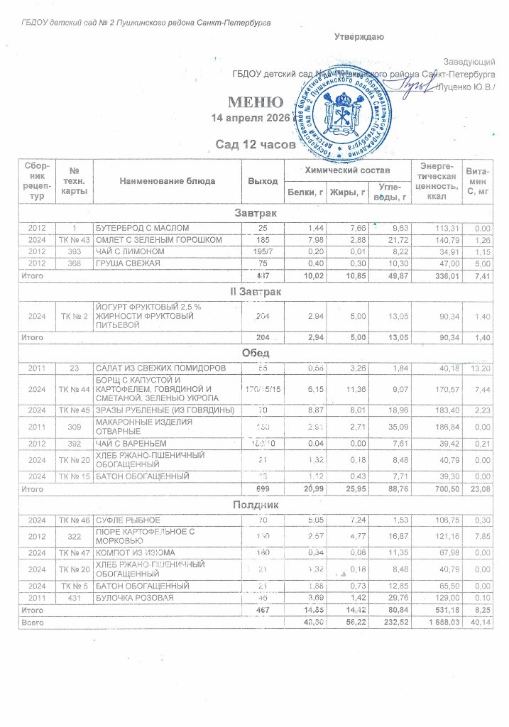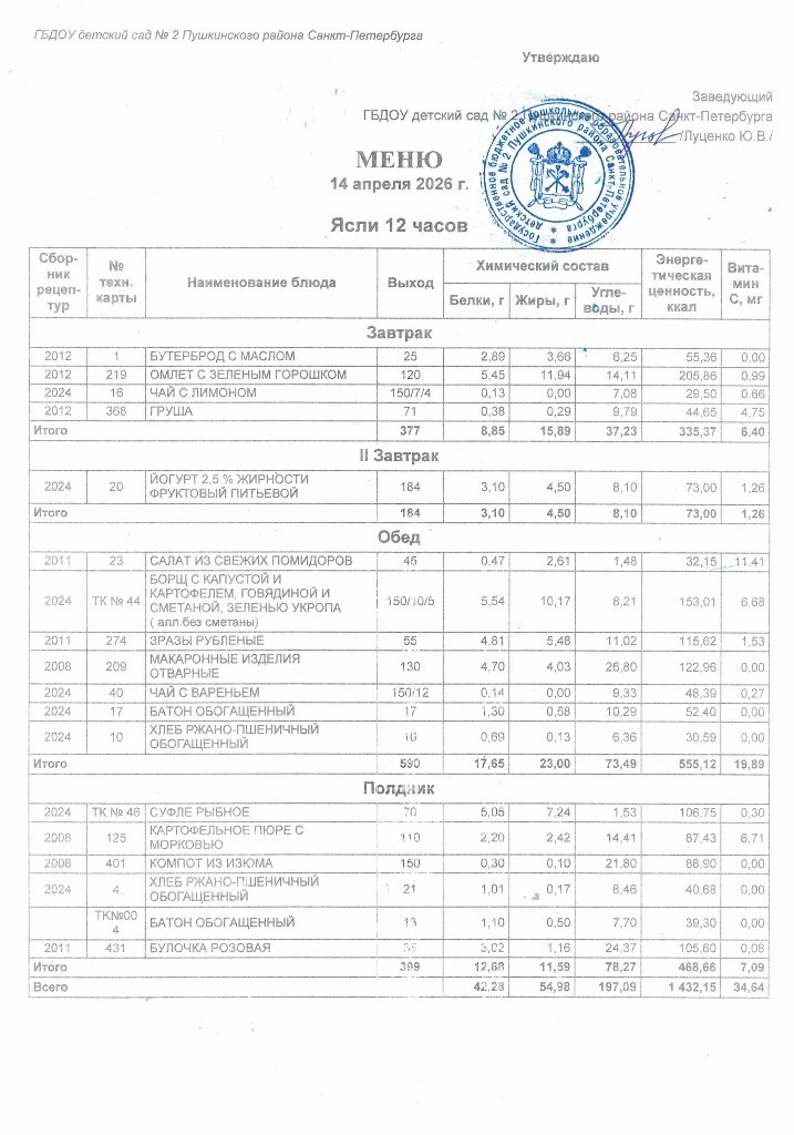 Меню на 14 апреля 2026