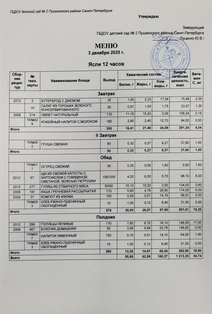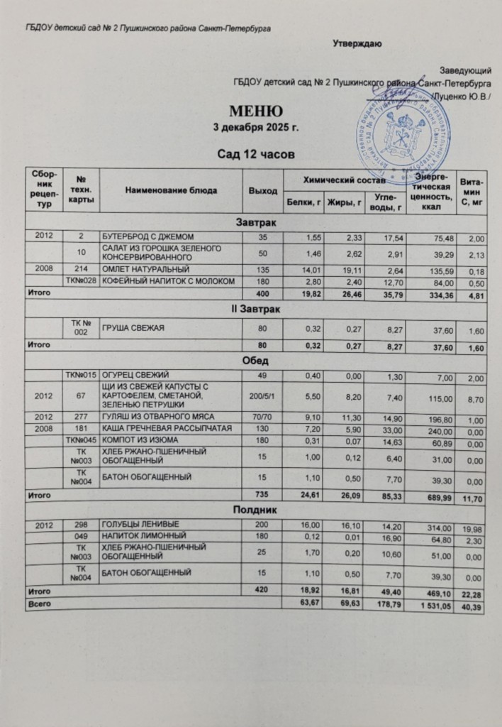 Меню на 03 декабря 2025 года