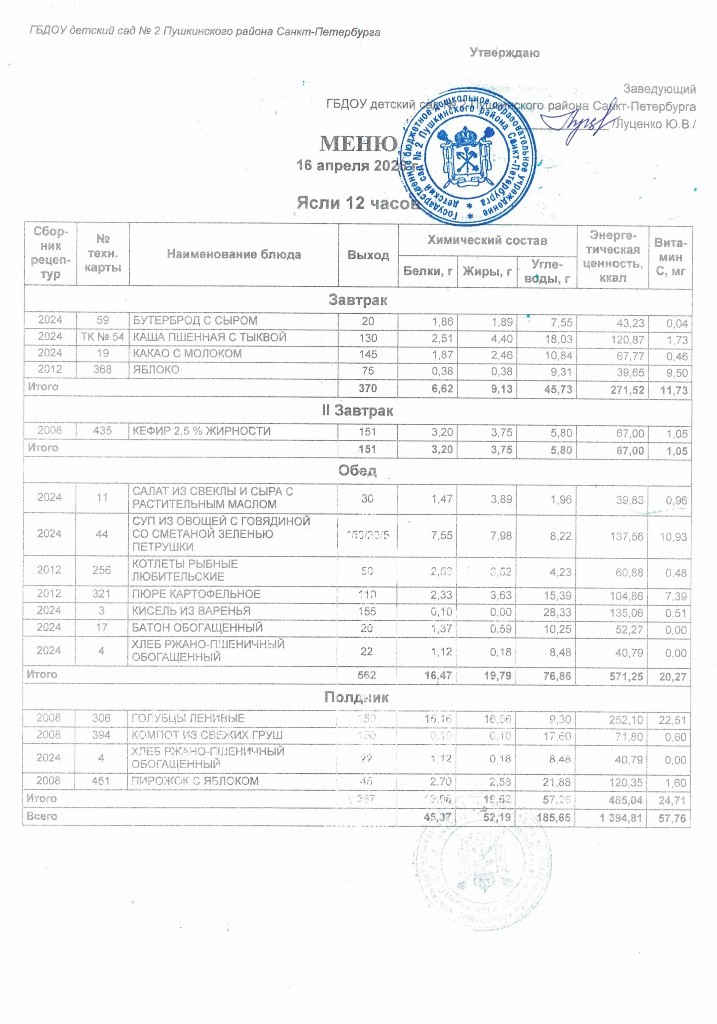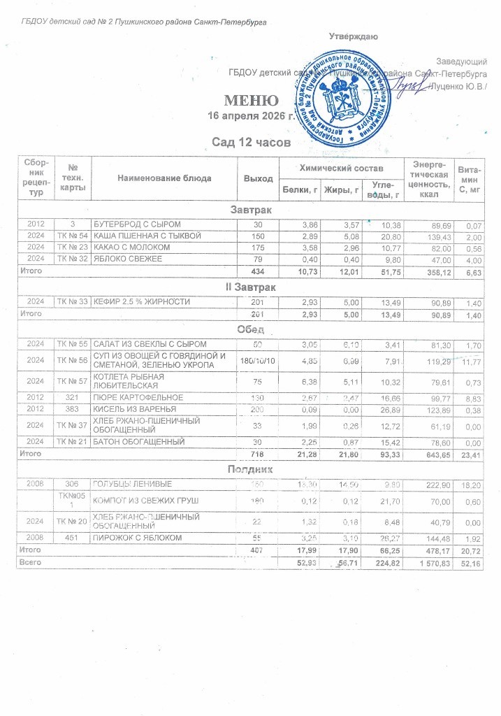 Меню на 16 апреля 2026